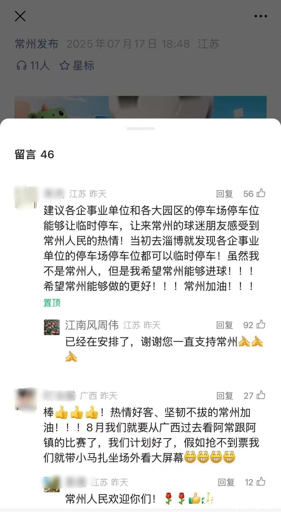 此前,7月17日,在常州队主场迎战徐州队之前,周伟就曾在“常州发布”留言区回复网友的建议,安排观赛停车事宜,被众多网友点赞。在此基础上,为听取市民和网友的建议,7月22日,“常宝许愿池”正式面向全国球迷和游客开放。“许愿池”的开放,为全国球迷和游客搭建起一个与常州畅所欲言对话的平台,截至目前,“常宝许愿池”已收到近15万条留言建议。